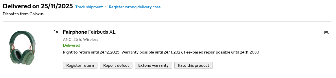 And I remembered, that Fairphone also sells some headphones, that are more repairable and sustainable. I also like the design, the green color with the pigments of recycled plastic go really well and look different from other brands. Plus the brown cable, the joystick controller and the CO2 neutrality sounds awesome. And when they were discounted by quite a bit (lowest price ever in Switzerland) a few days before black Friday, I decided to pull the trigger and get them.