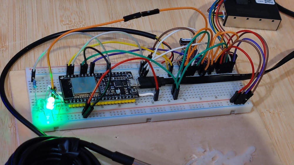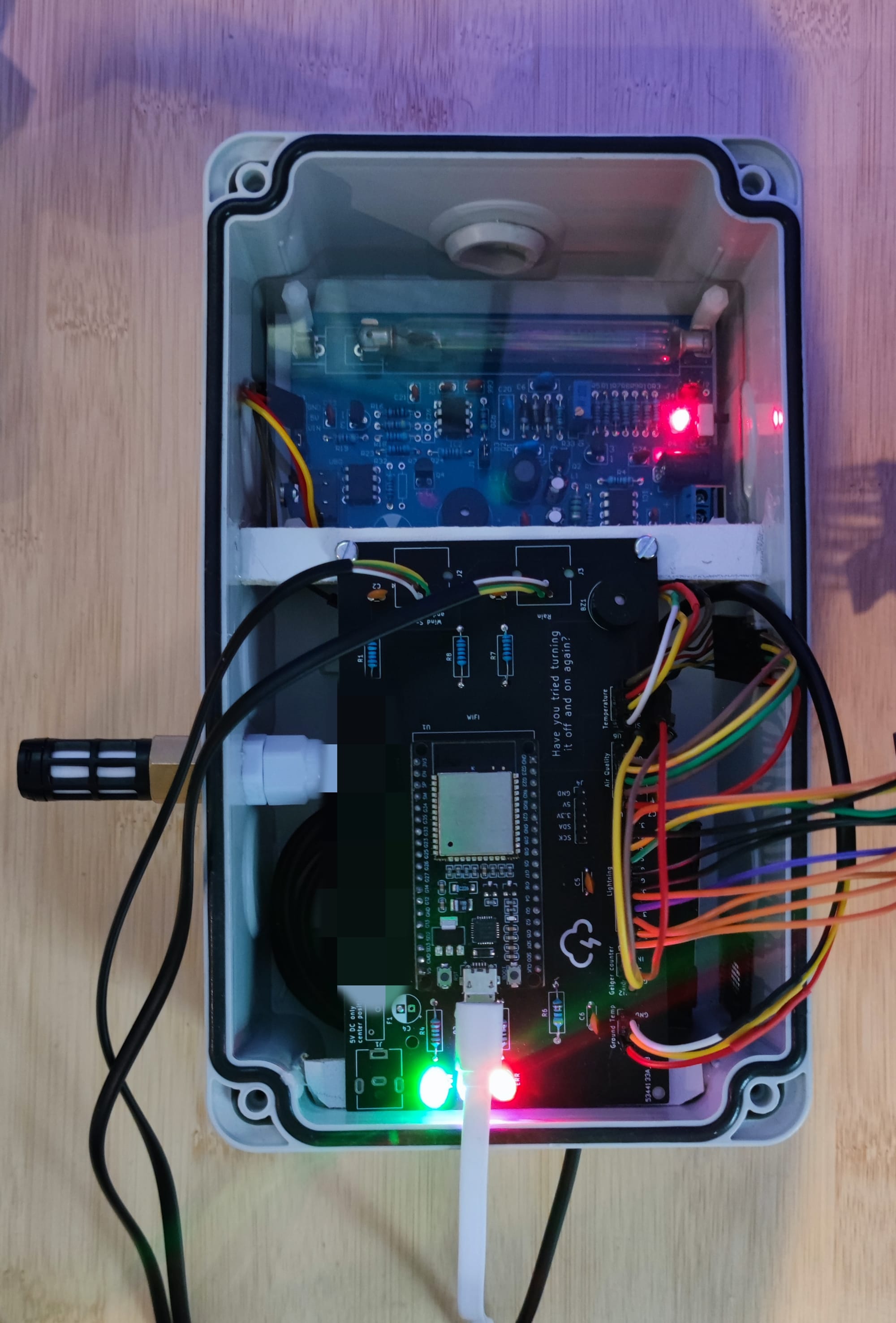 This was the first-ever iteration of the project. It served as a minimal proof of concept and to collect experience with the ESP32 microcontroller, since I haven't had much experience with it back then. It used breadboard jumper cables and several external sensors, such as the SEN54 and the DS18B20.
